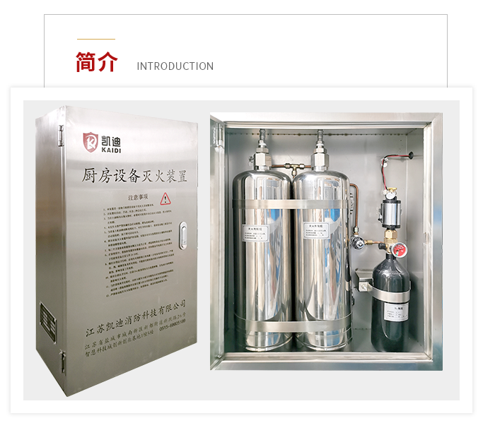 本裝置是一套獨立的廚房專用自動滅火系統,有自動、手動、機械應急三種啟動方式。裝置體積小,安裝不占廚房面積,只占用空間位置。性能可靠,啟動靈活,操作維護簡便。