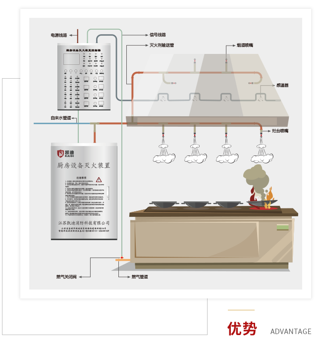 凱迪廚房設備滅火裝置,固定安裝于廚房油煙灶、油煙通風管道里等環境中,是能夠自動探測并實施滅火的箱式滅火裝置